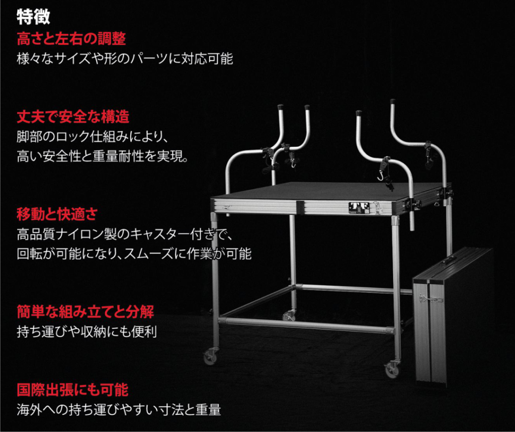 デントリペアのために開発されたTF HOOD STANDは実用性と効率化を追求された、高品質なアルミニウム製で、軽量かつ頑丈で、使いやすさも兼ね備えた革新的なスタンドです。
